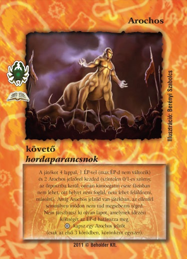 A játékot 4 lappal, 1 ÉP-vel (max.ÉP-d nem változik) és 2 Arochos jelz?vel kezded (színtelen 0/1-es szörny, az ?rposztba kerül, onnan kimozgatni csere fázisban nem lehet, ott helyet nem foglal, nem lehet feláldozni, másolni). Amíg Arochos jelz?d van játékban, az ellenfél semmilyen módon nem tud megsebezni téged. Nem játszhatsz ki olyan lapot, amelynek idézési költségét az ÉP-d határozza meg. 0_VP: kapsz egy Arochos jelz?t (csak az els? 3 körödben, körönként egyszer).